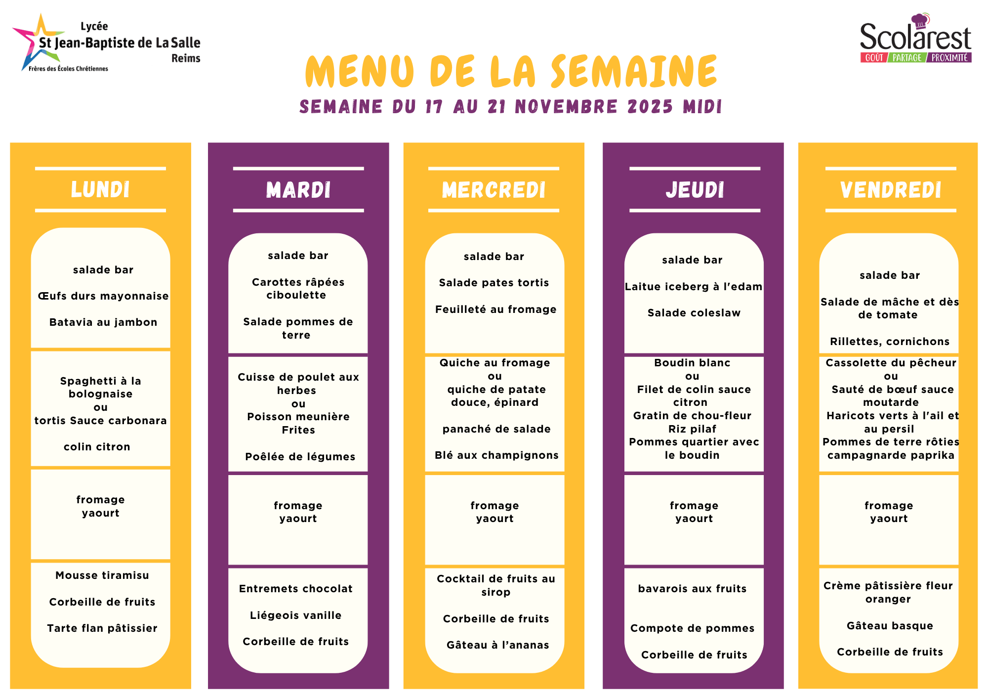 Menu du 17 au 21 novembre 2025